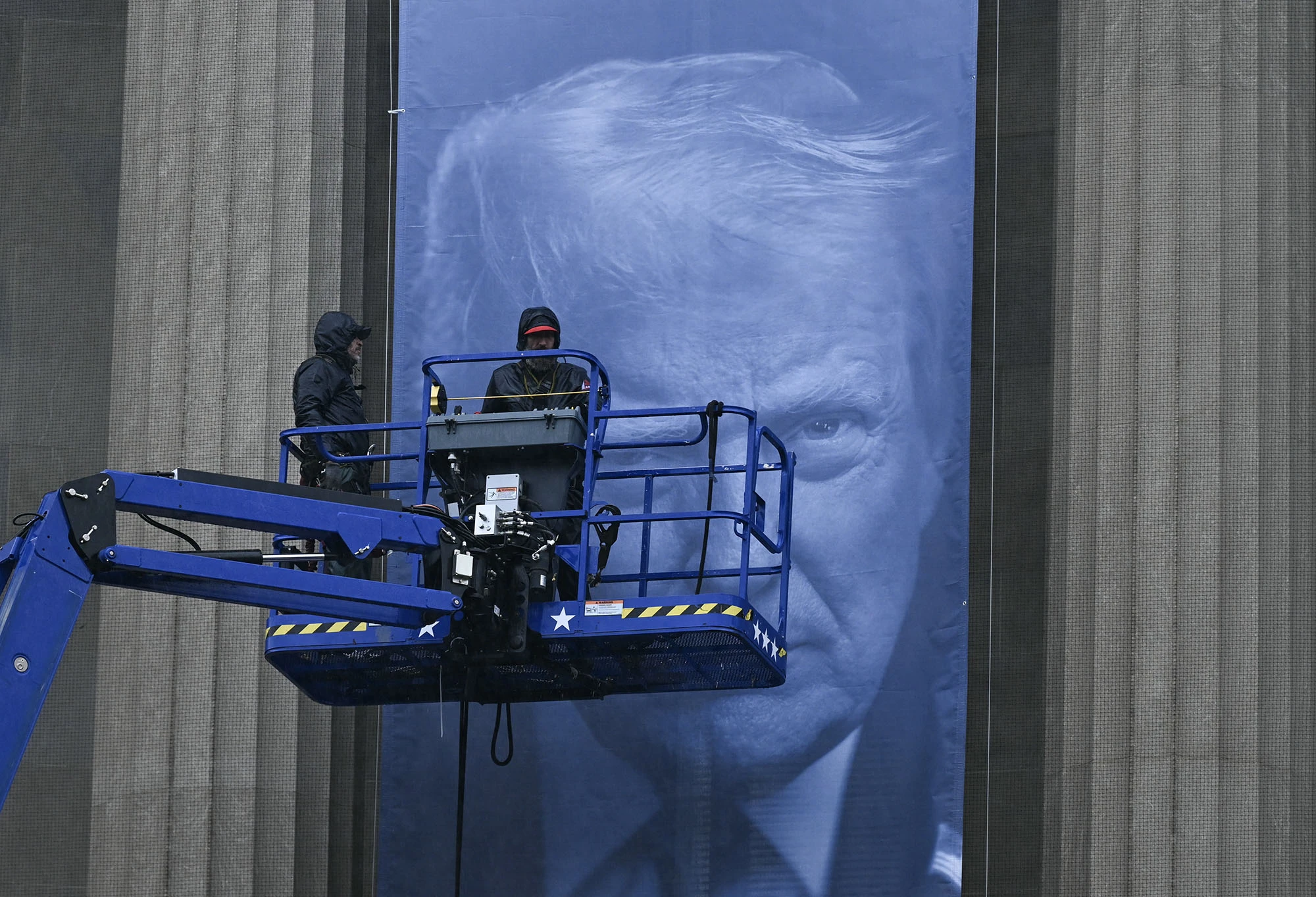 Instalación de un cartel con la imagen de Donald Trump, en la fachada de la sede del Departamento de Justicia de Estados Unidos, el 19 de febrero en Washington DC.