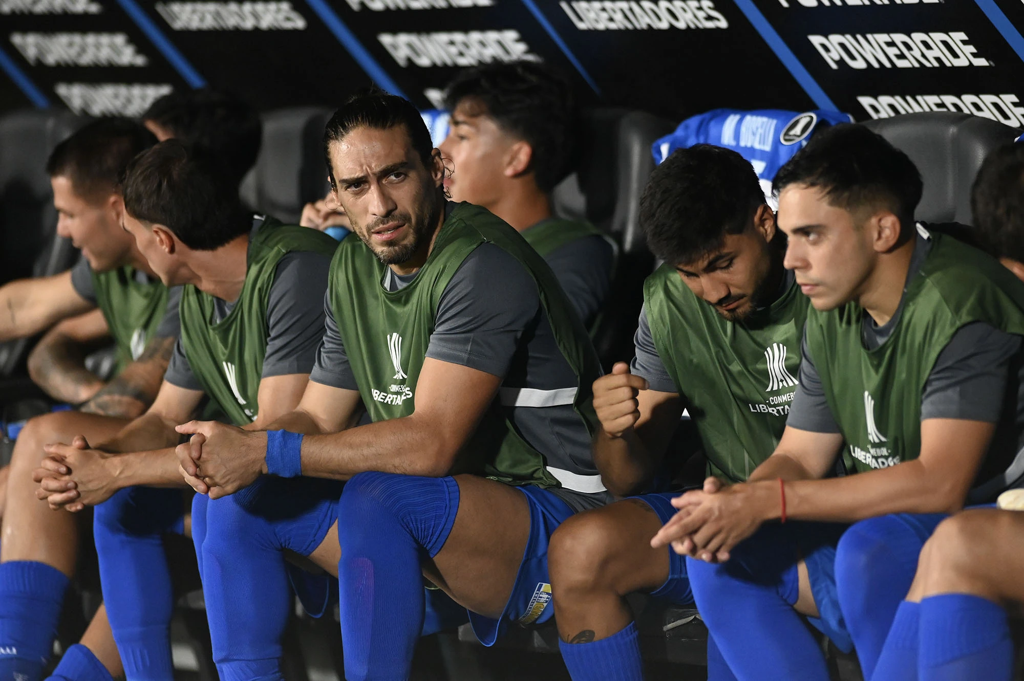 Martín Cáceres, junto a sus compañeros de Juventud de Las Piedras, durante el encuentro ante Universidad Católica de Ecuador por la Copa Libertadores, el 5 de febrero en el estadio Centenario.