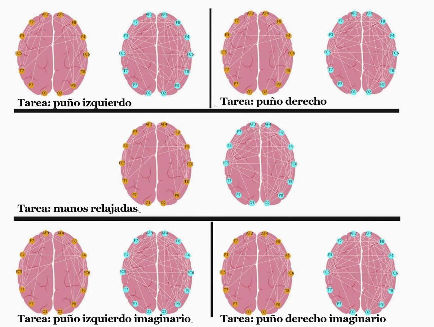 Grafos de redes cerebrales de mujeres sedentarias (nodos naranjas) y jugadoras amateur de handball (nodos azules). Tomado de Meléndez et al. 2026