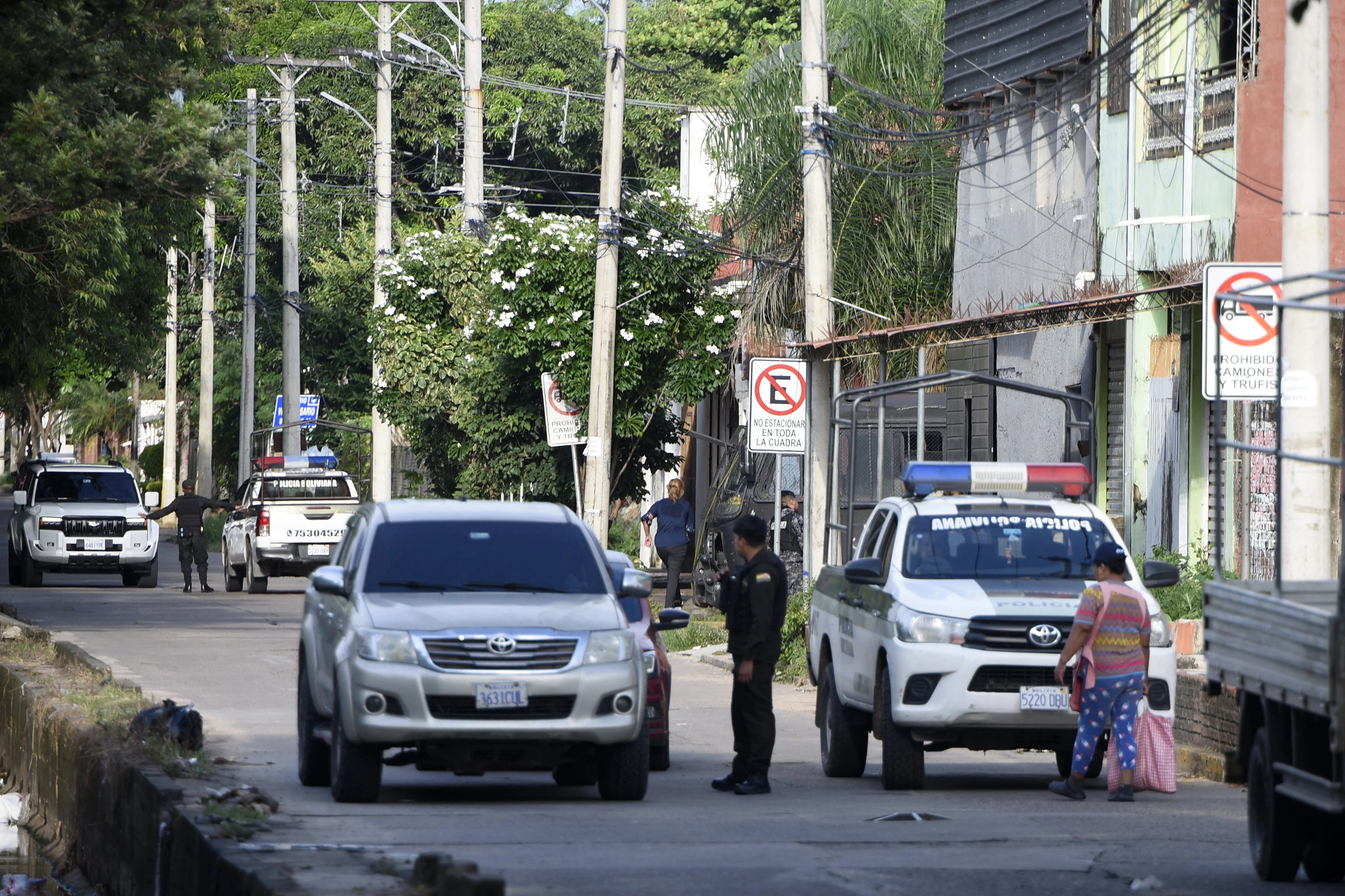 Agentes de policía participan en una operación en el barrio de Las Palmas, en Santa Cruz de la Sierra (Bolivia), tras la detención del narcotraficante uruguayo Sebastián Marset, el 13 de marzo.