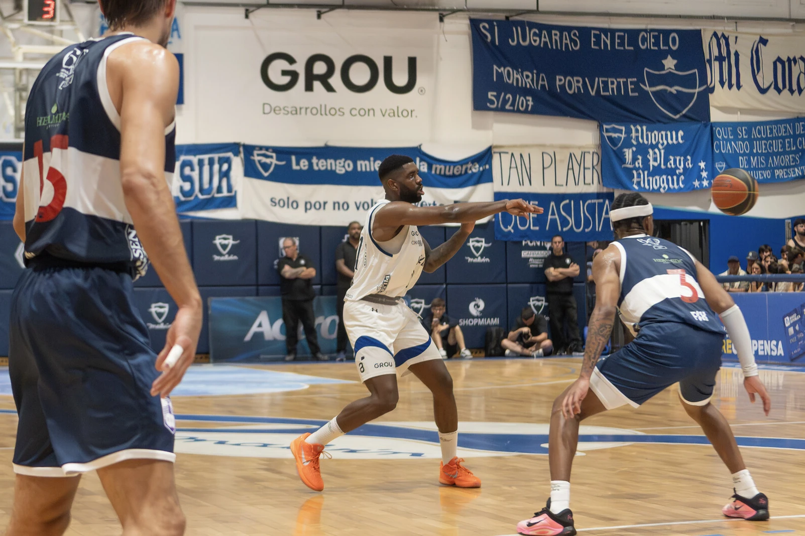 Joshua Webster, de Malvín (C), y Facundo Terra y Elijah Weaver, de Defensor Sporting, el 19 de enero, en el Club Malvín.