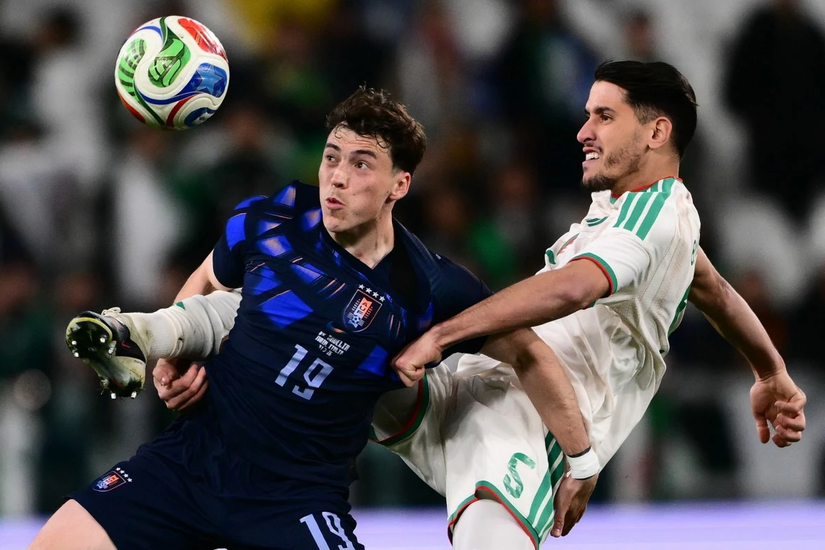 El delantero uruguayo Federico Viñas, con el defensa argelino Zineddine Belaid, durante el partido amistoso internacional de fútbol entre Argelia y Uruguay en el Estadio Allianz de Turín, el 31 de marzo.