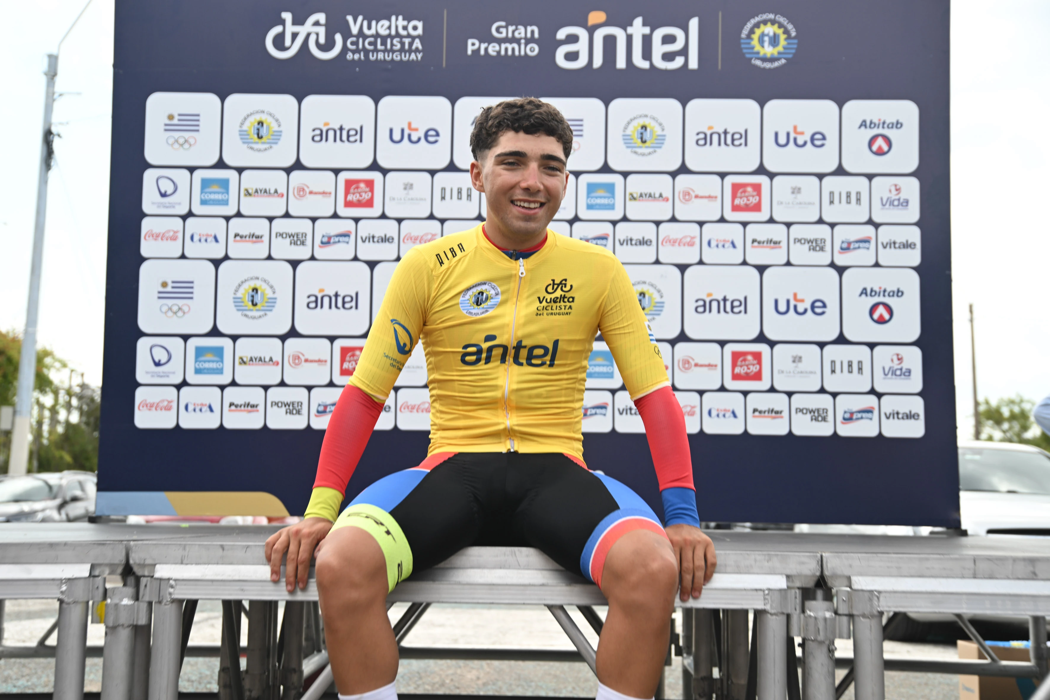 Pablo Bonilla, del Club Náutico y de Pesca Boca de Cufré, malla oro, en el podio de la etapa 3, Paso de los Toros - Mercedes, sobre 180 km., de la 81ª Vuelta Ciclista del Uruguay el 28 de marzo.