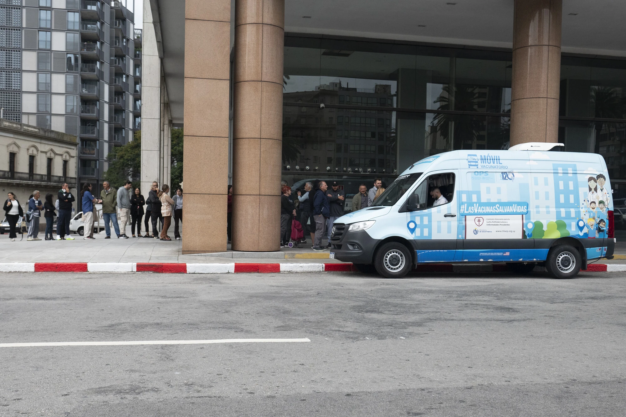 Vacunatorio frente a la plaza Independencia, el 6 de abril, en Montevideo.