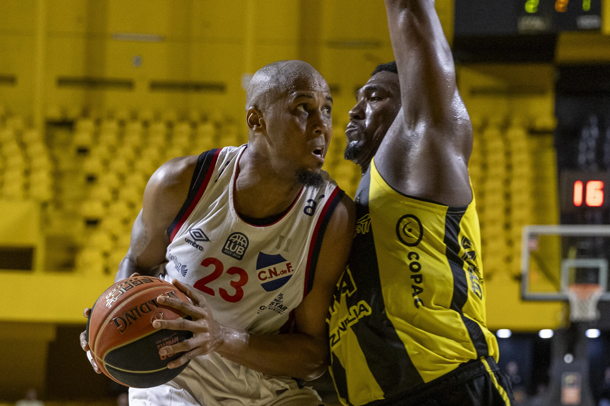 Ernesto Oglivie de Nacional y Andrés Ibarguen, de Peñarol, en el Palacio Peñarol (archivo, 2025)