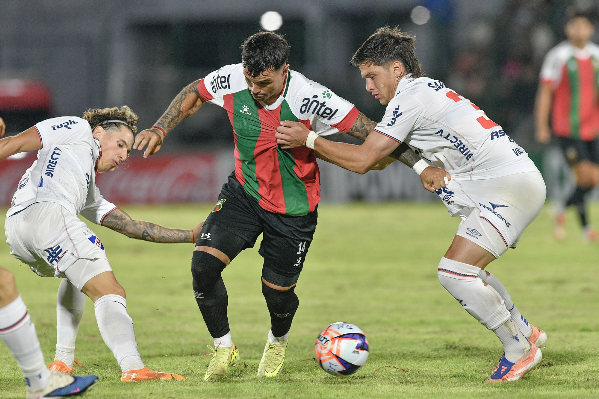 Christian Tabó, de Deportivo Maldonado, entre Luciano Boggio y Tomás Viera, de Nacional, el 11 de abril en el estadio Domingo Burgueño, en Maldonado.