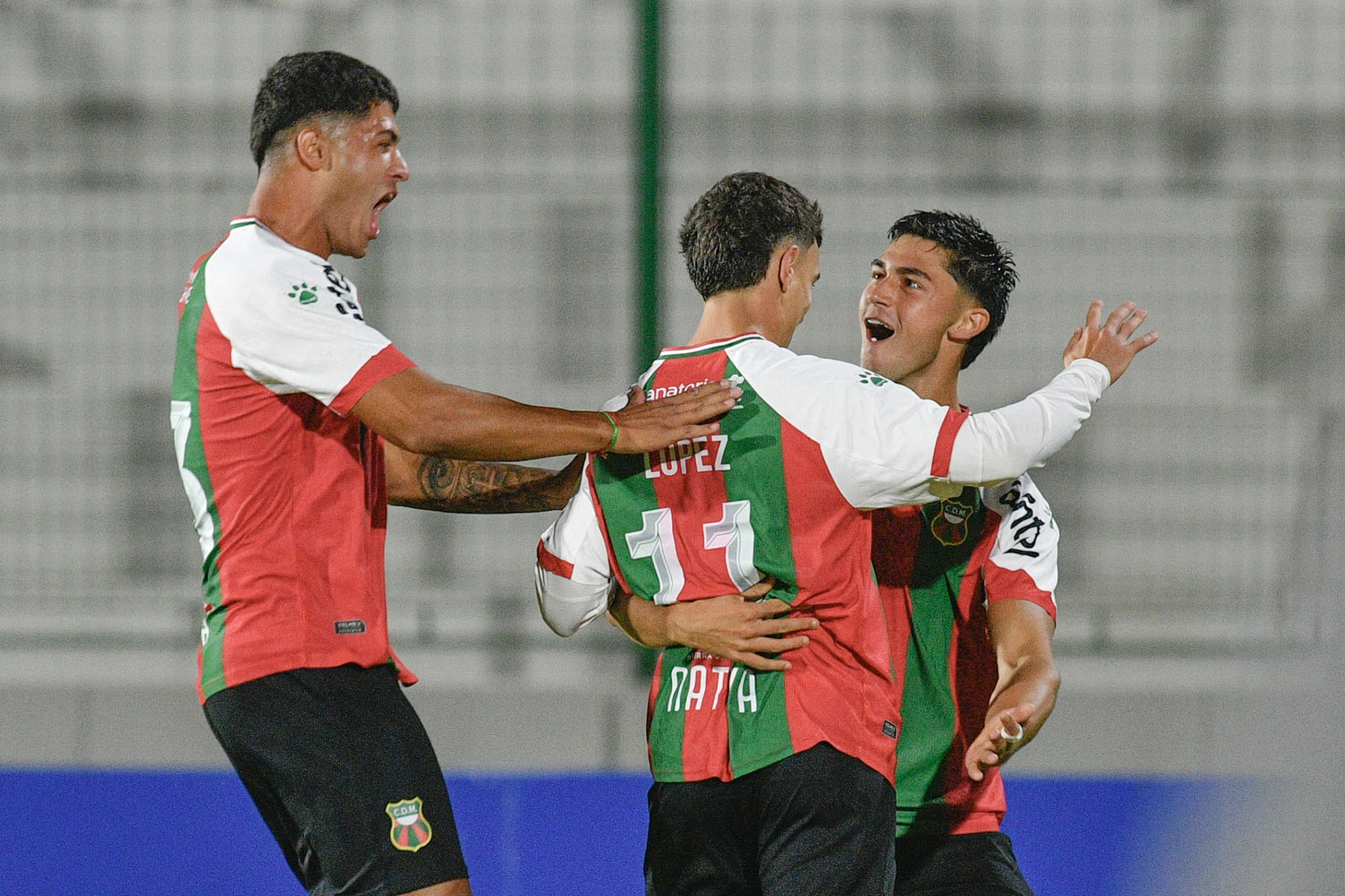 Guillermo López, de Deportivo Maldonado, con Adrián Vila y Elías de León, tras convertir el tercer gol de su equipo.