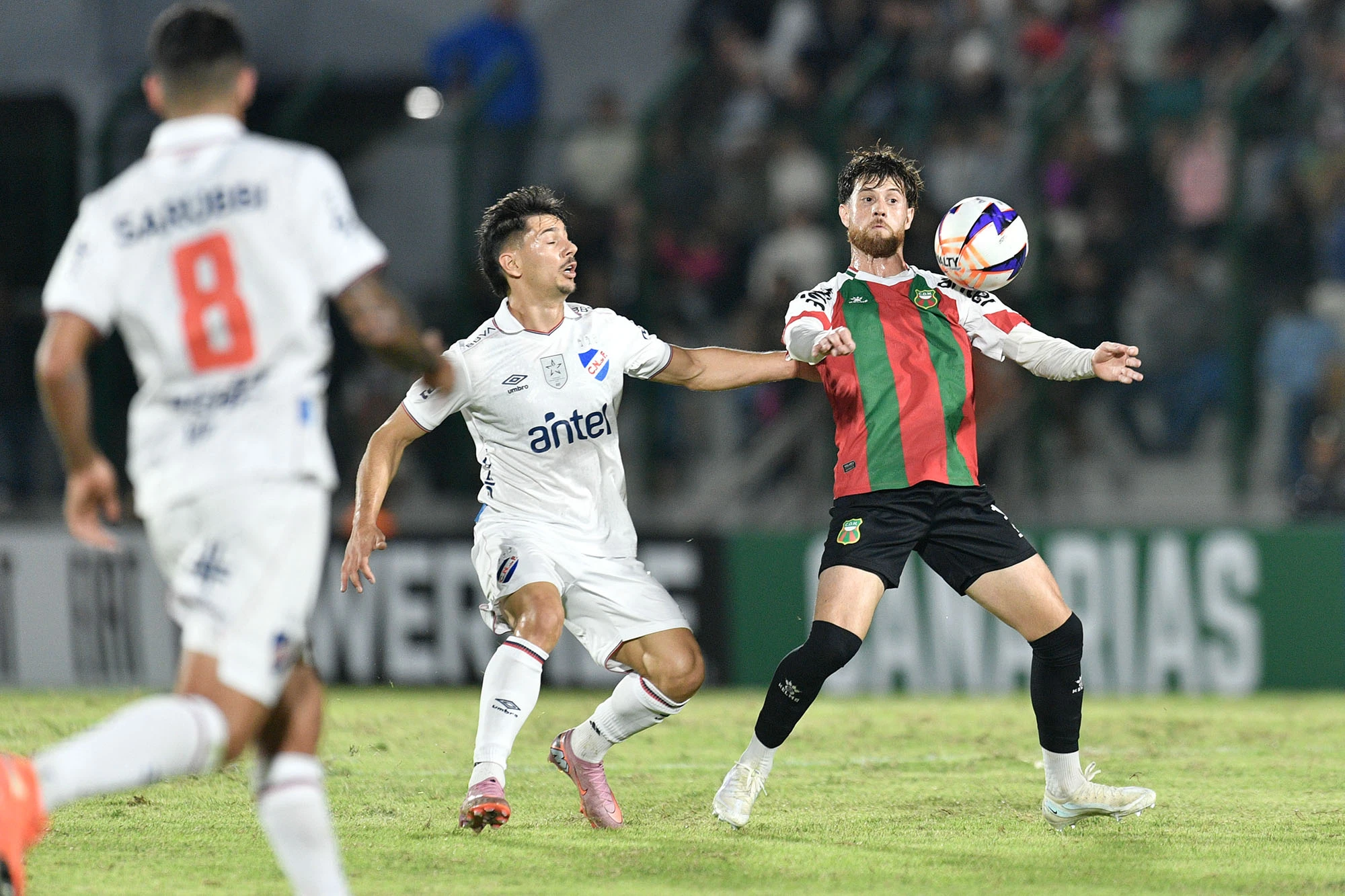 Maximiliano Silvera, de Nacional y Santiago Ramírez, de Deportivo Maldonado, el 11 de abril en el estadio Domingo Burgueño, en Maldonado.