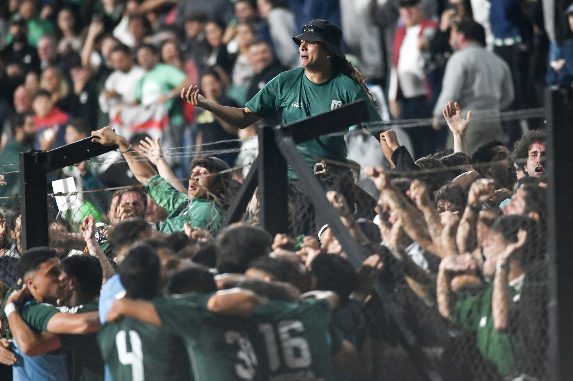 Jugadores e hinchas de Racing festejan el triunfo el 12 de abril ante Wanderers, en el Parque Viera.