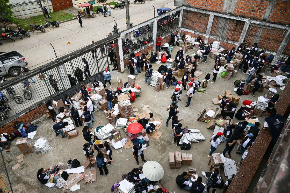 Funcionarios de la Oficina Nacional de Procesos Electorales de Perú durante el segundo día de las elecciones presidenciales en Pucallpa, el 13 de abril.
