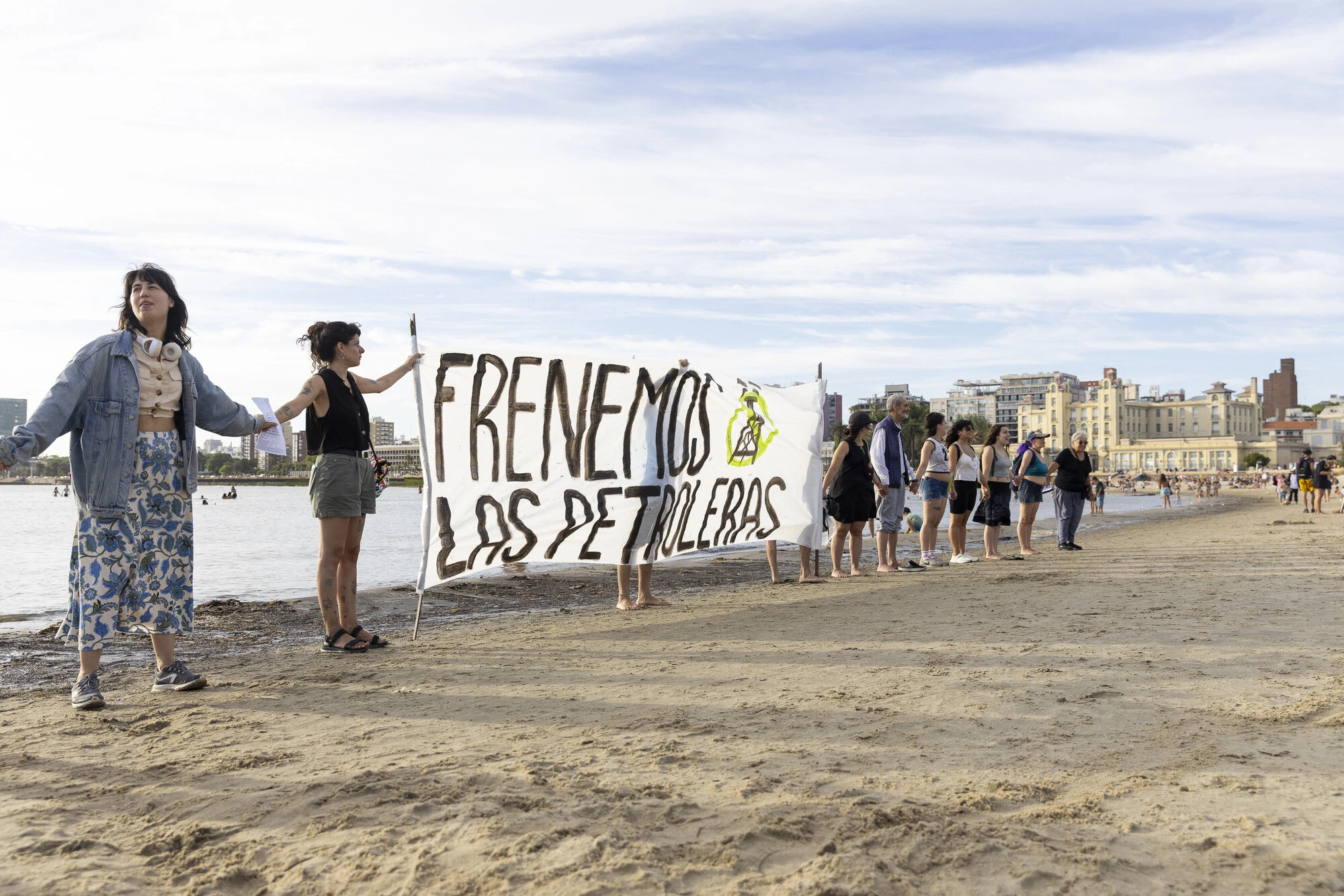 Movilización en cadena humana, en oposición a la prospección sísmica en Uruguay, en la playa Ramírez (archivo, enero de 2026).