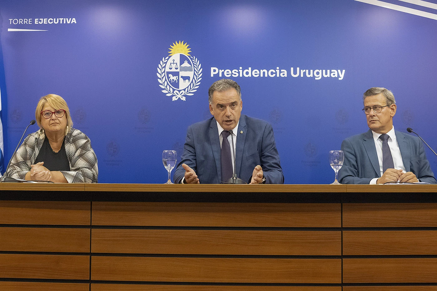 La ministra Sandra Lazo, el presidente Yamandú Orsi, y el prosecretario de la presidencia, Jorge Díaz durante la conferencia que brindaron tras el Consejo de Ministros en Torre Ejecutiva.