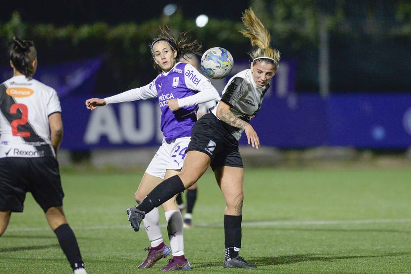 Manuela Olivera, de Defensor Sporting, y Saiara Pacífico, de Danubio, durante un partido del Torneo Intermedio en el Parque Palermo (archivo, agosto de 2023).