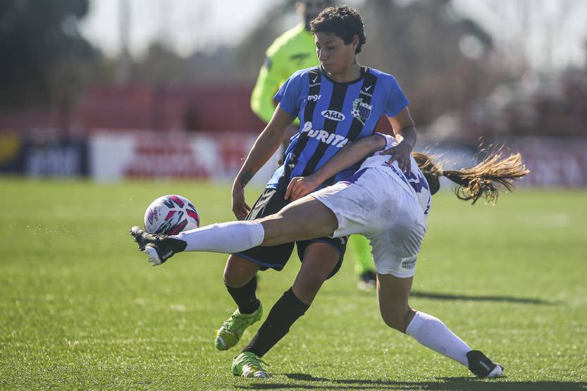 Victoria Vázquez, de Liverpool y Magdalena Olivera, de Defensor Sporting, durante un partido por la fecha 2 del campeonato Apertura Femenino, en la cancha de Rentistas (archivo, julio de 2022).