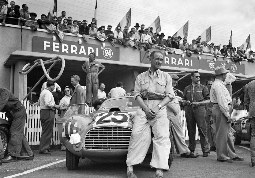 El piloto francés Raymond Sommer, junto a la Ferrari 195 SC n°25, el 24 de junio de 1950, antes del inicio de la 18ª edición de las 24 horas de Le Mans, en el circuito de Le Mans. Foto: Dugue, AFP