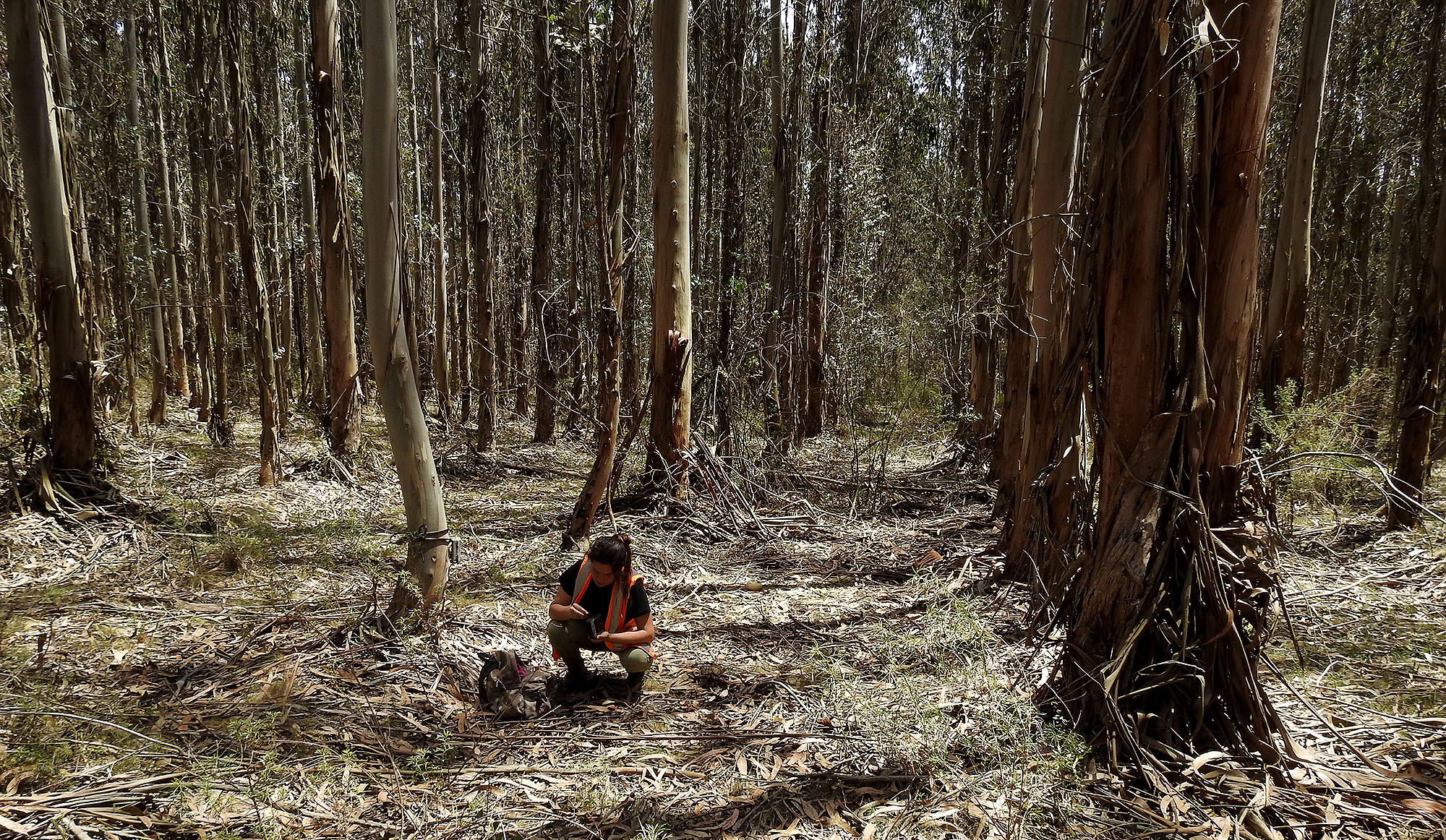 Alexandra Cravino con cámara trampa en predio forestado. Foto: Jorge Cravino