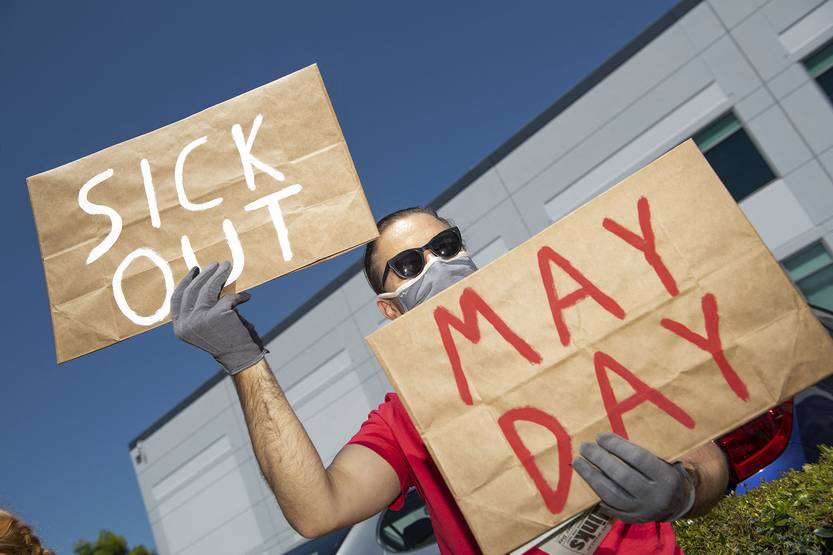 Trabajadores de Amazon protestan contra la falta de protección por parte de la empresa, en el centro de entrega de Amazon en Hawthorne, California.