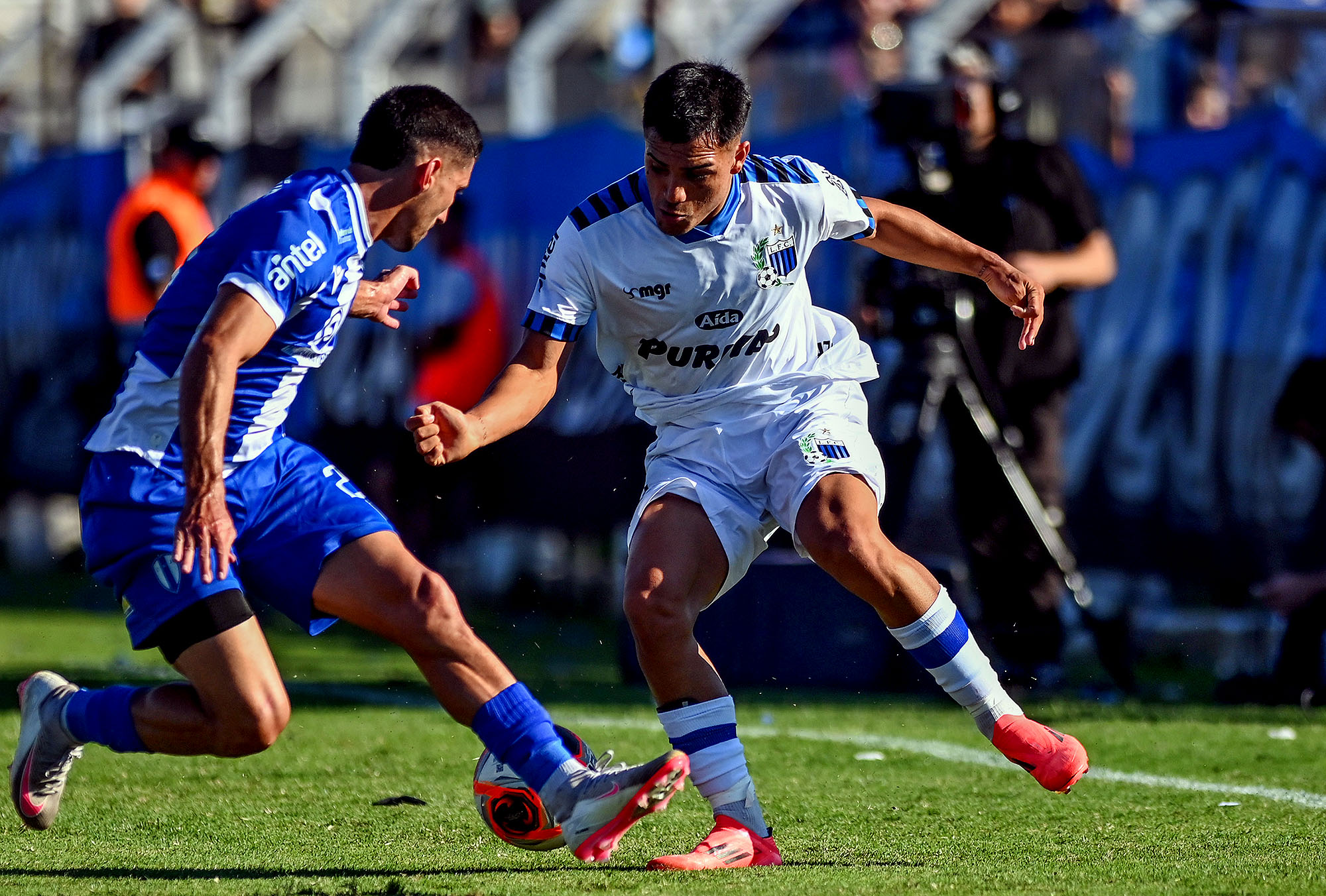 Federico Barrandeguy, de Juventud, y Javier Vallejo, de Liverpool, el 4 de mayo, en el Parque Artigas de Las Piedras.