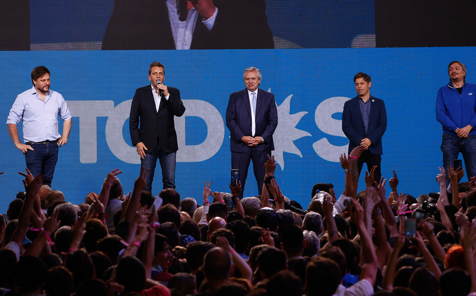 Alberto Fernández, junto a Leandro Santoro, Sergio Massa, Axel Kicillof, y Máximo Kirchner, tras conocer los resultados de las elecciones, en Buenos Aires.