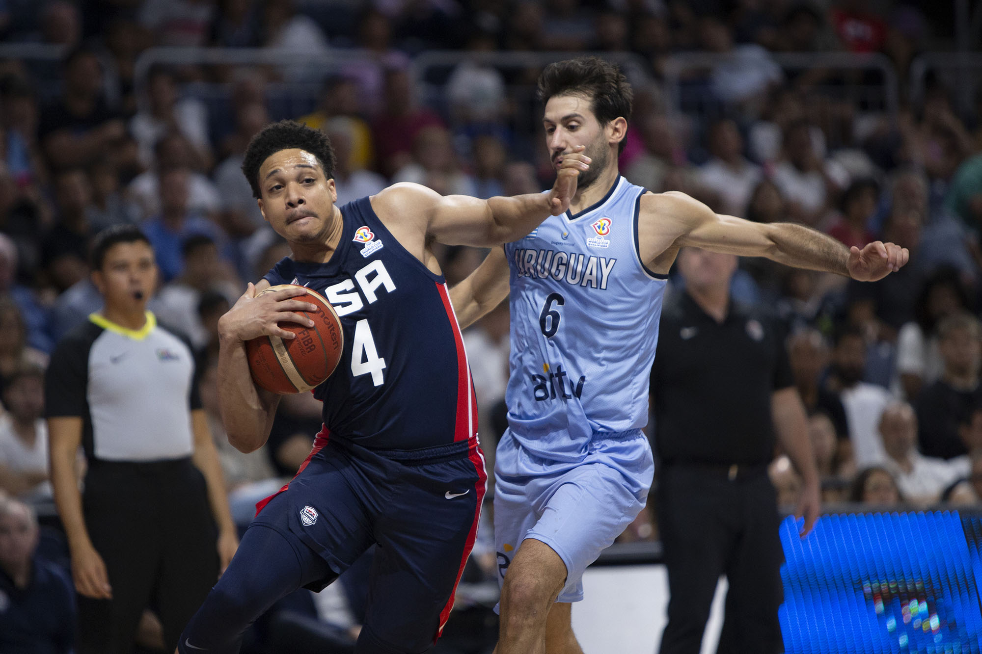 Bruno Fitipaldo, de Uruguay, y Abdul Gaddy, de Estados Unidos, este jueves, en el Antel Arena.