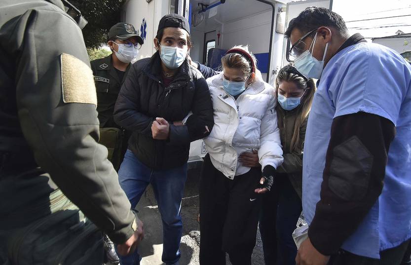 Jeanine Áñez, expresidenta de facto de Bolivia, camina acompañada por sus hijos José Armando Ribera (i) y Carolina Ribera (d) hacia un centro médico para realizarse exámenes, el martes, en La Paz, Bolivia.