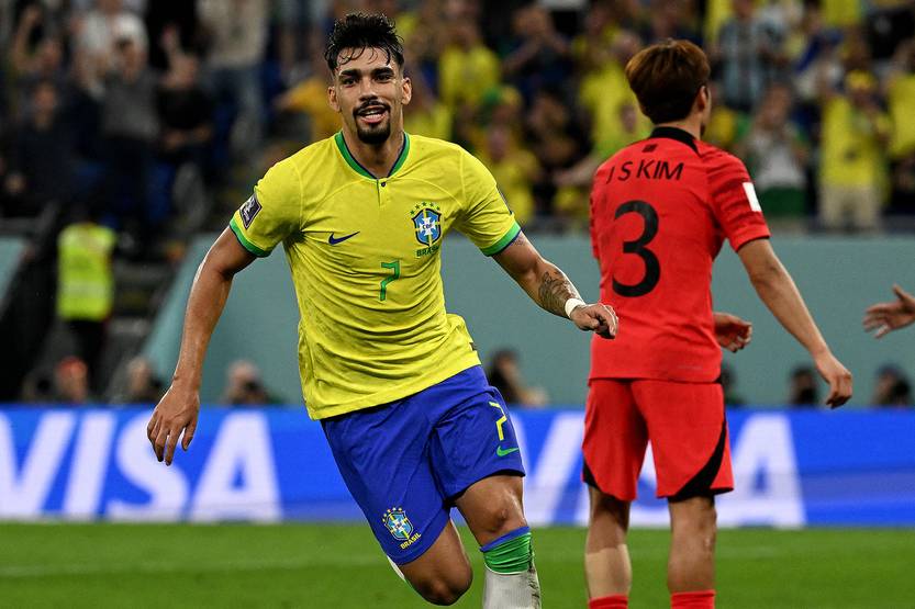 Lucas Paqueta, de Brasil, después de marcar el cuarto gol a Corea del Sur, ayer, en el Estadio 974, en Doha.