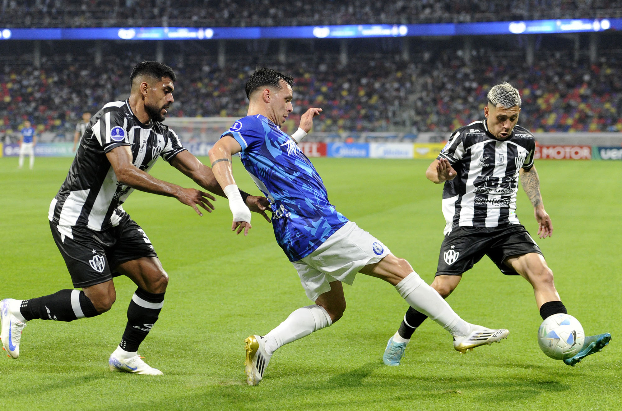 Leandro Otormín, de Cerro Largo, y Santiago Moyano e Iván Gómez, de Central Córdoba, el 15 de julio, en el estadio Madre de Ciudades, en Santiago del Estero, Argentina.