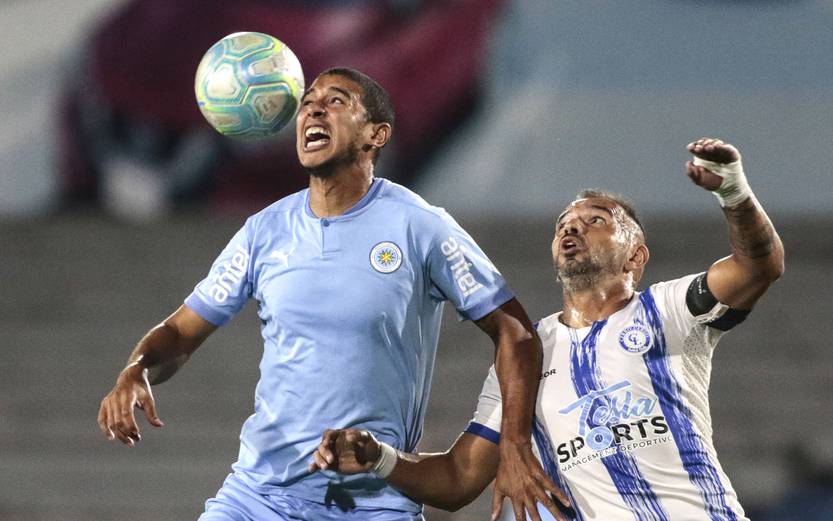 Diego Arismendi, de Torque, y Enzo Borges, de Cerro Largo, en el estadio Charrúa (archivo, febrero de 2021).