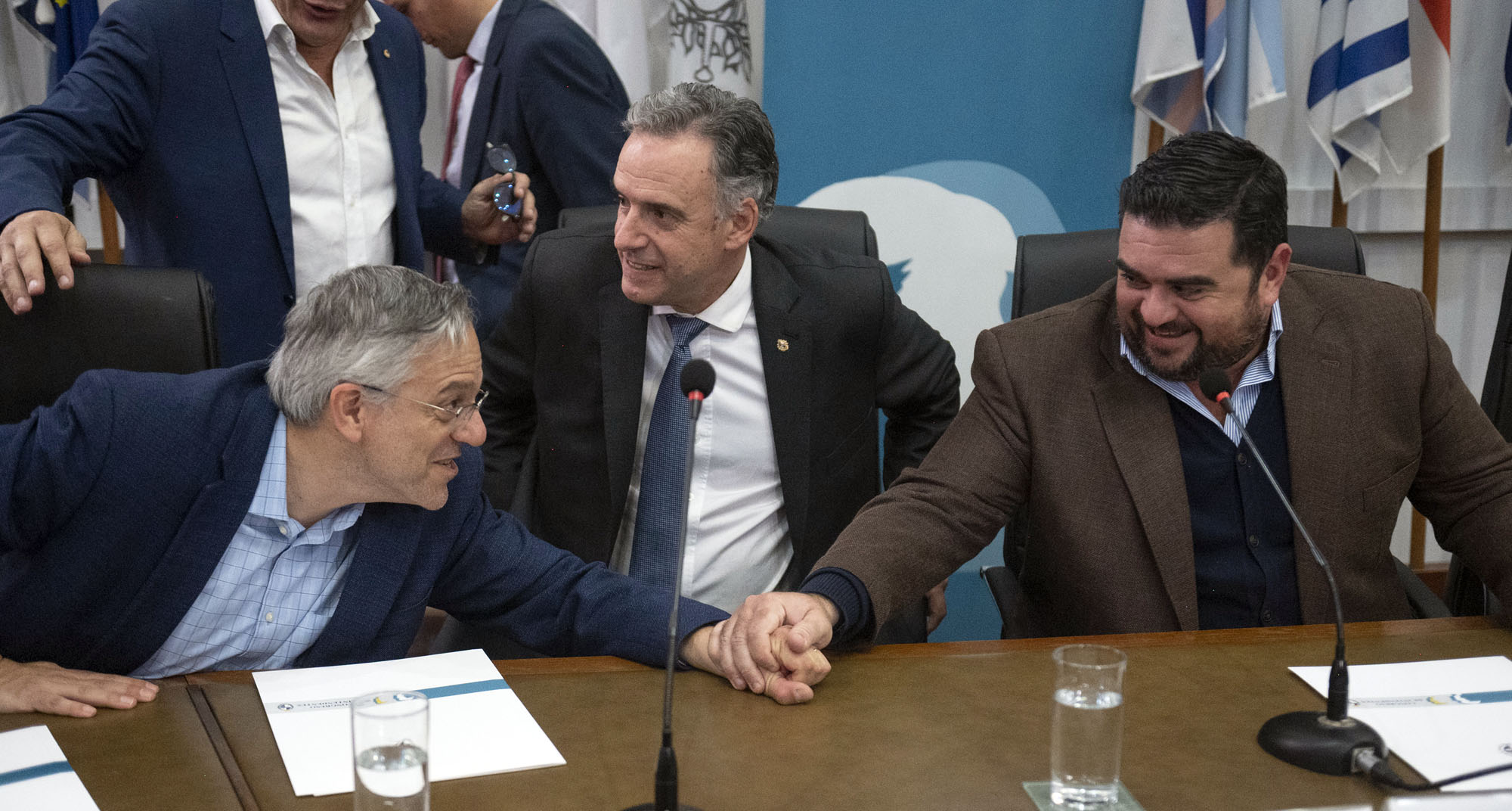 Rodrigo Arim, Yamandú Orsi y Nicolás Olivera, el 30 de julio, en el Congreso de Intendentes.