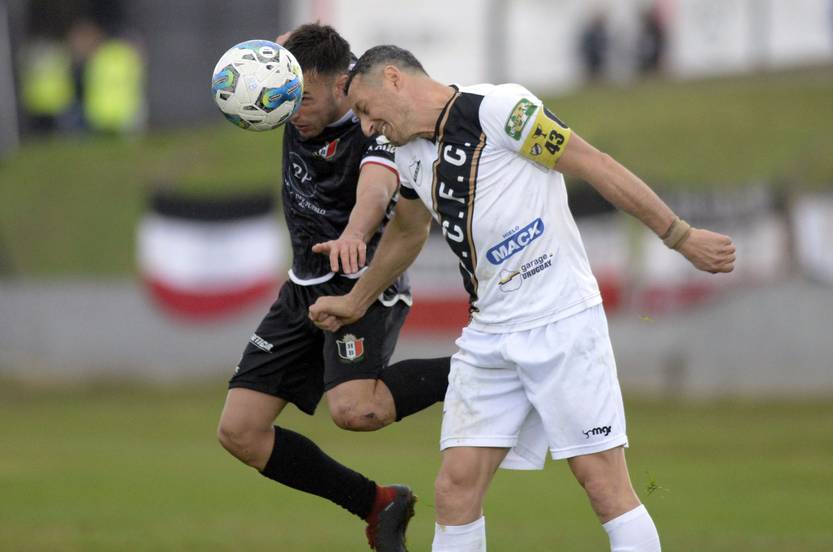 Matías Núñez, de Huracán Buceo, y Juan Viera, de Ferro Carril, en el Parque Huracán (archivo, setiembre de 2023).