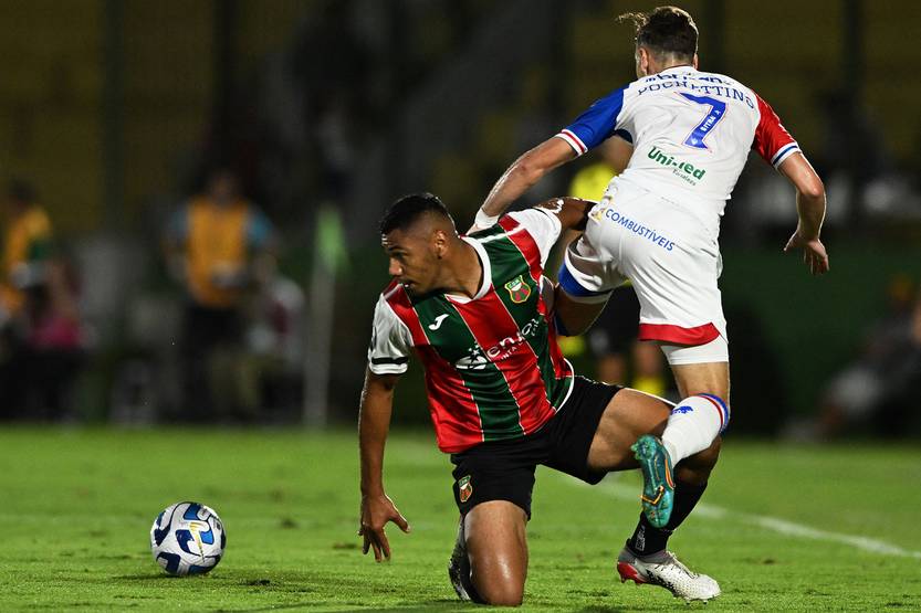 Ángel Cayetano, de Deportivo Maldonado, y Tomas Pochettino, de Fortaleza, en el estadio Domingo Burgueño Miguel, en Maldonado (23.02.2023).