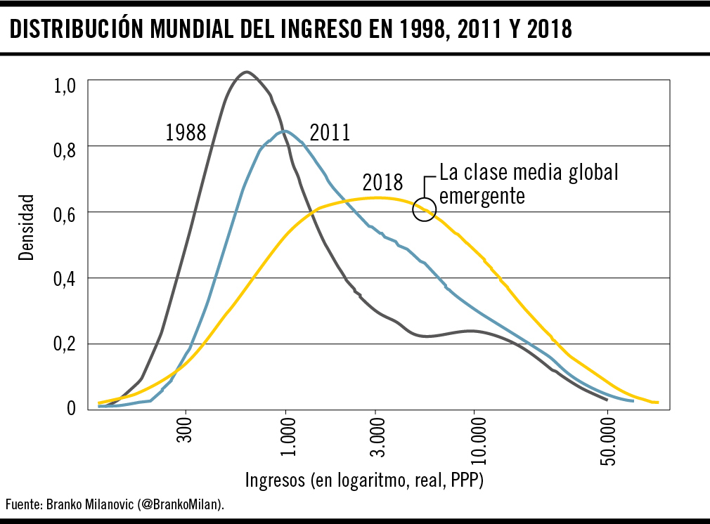 Distribución mundial del ingreso en 1998, 2011 y 2018