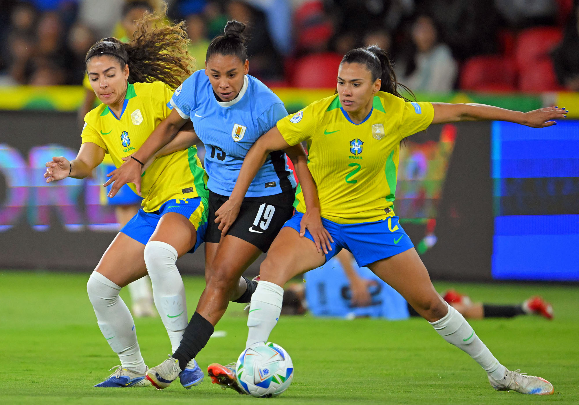 La uruguaya Wendy Carballo entre las brasileñas Angelina Alonso y Antonia, el 29 de julio, en el estadio Rodrigo Paz Delgado, en Quito.