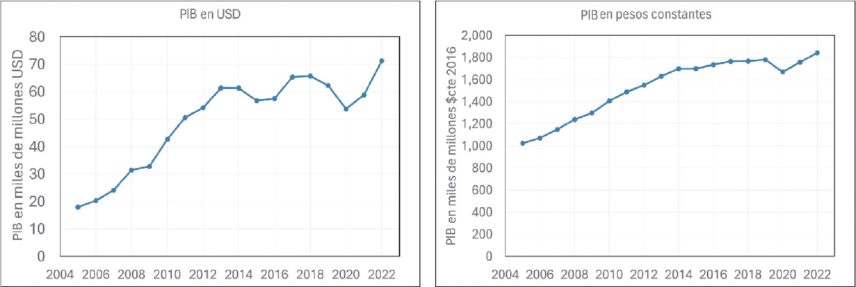 Figura1: Evolución del PIB de Uruguay, a) en USD, b) en pesos constantes 2016.