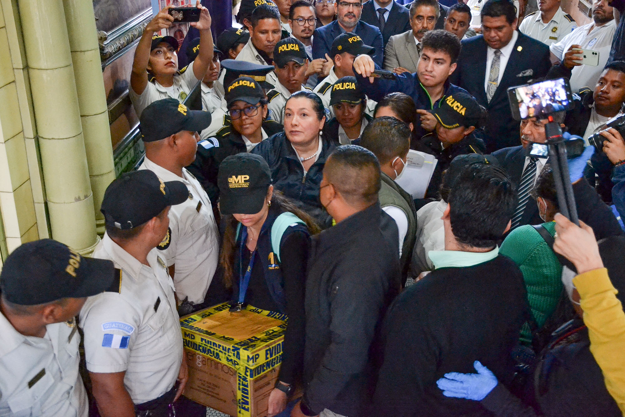 Fiscales del Ministerio Público retiran cajas con actas de escrutinio de las elecciones, durante allanamiento en la sede del Tribunal Supremo Electoral de Guatemala (30.09.2023).