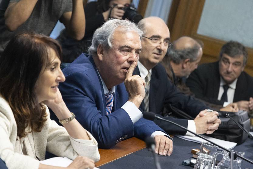 Carmen Asiaín, Luis Alberto Heber, Guillermo Maciel, Jorge Saravia y Sergio Botana, con senadores del Partido Nacional, en el Palacio Legislativo (23.10.2023).