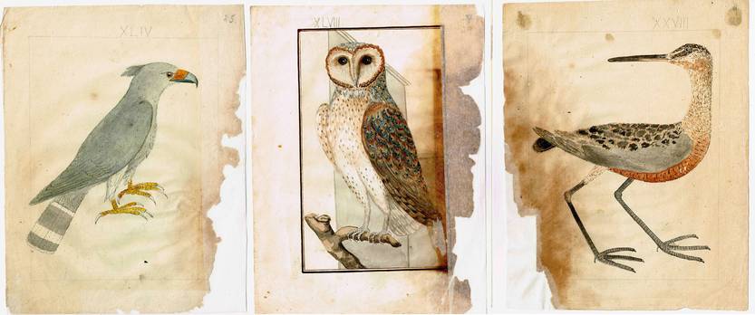 Ilustraciones de Larrañaga de águila coronada, lechuza de campanario y becasa de mar.