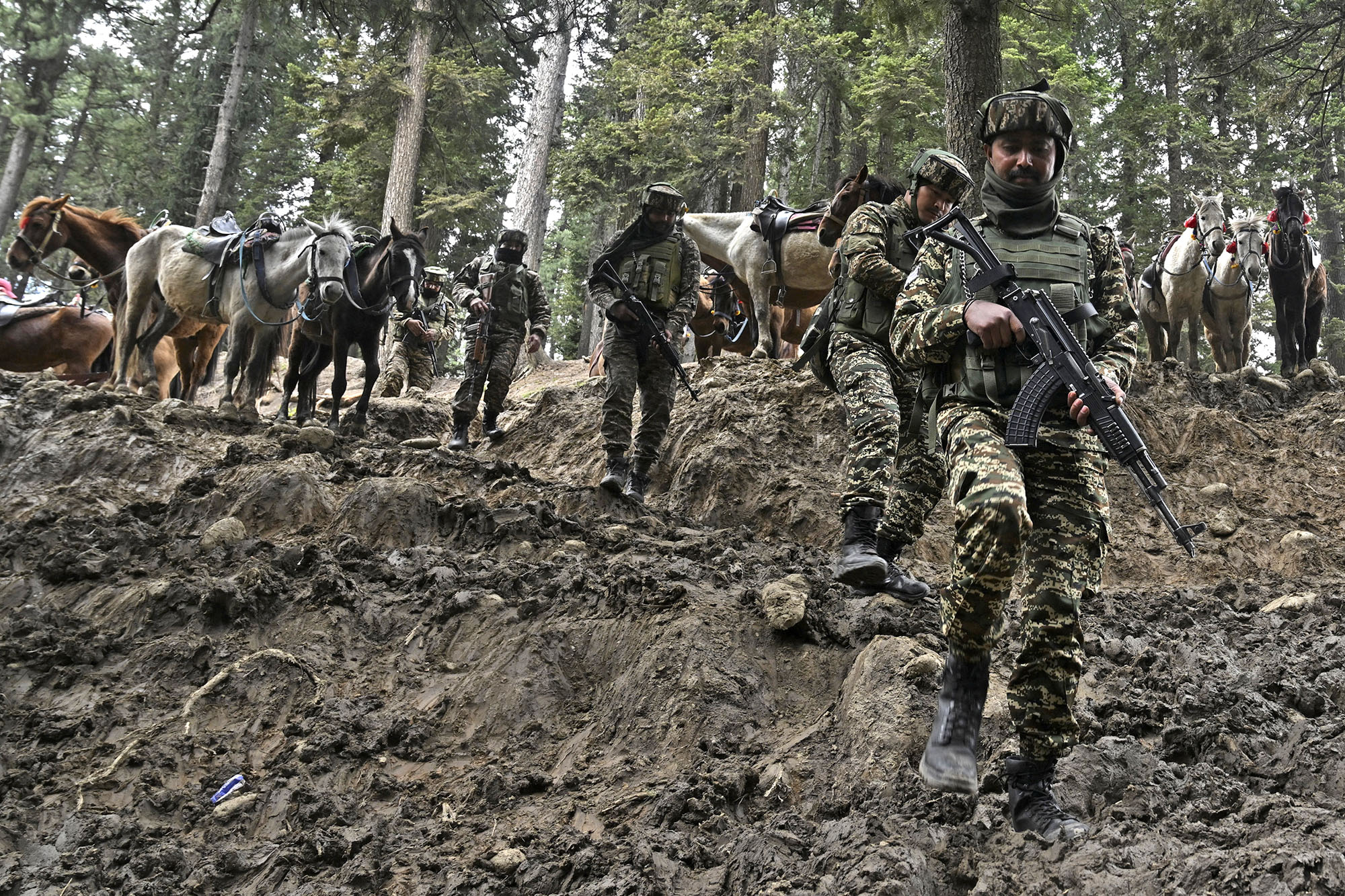 Soldados indios regresan tras una operación de búsqueda, el 23 de abril, en la pradera de Baisaran.