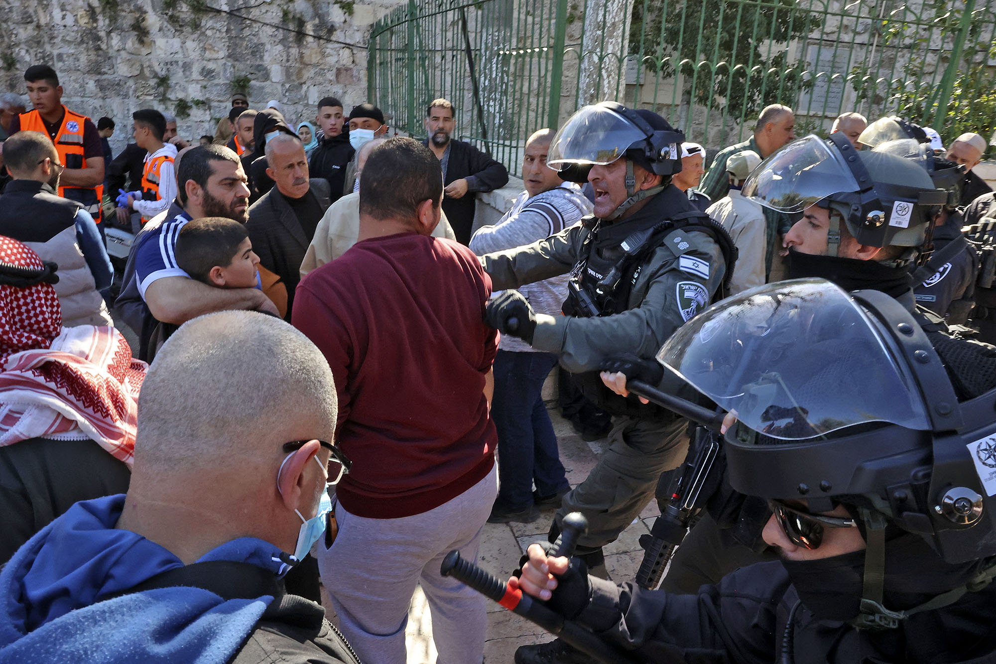 Las fuerzas de seguridad israelíes impiden el ingreso de palestinos a la mezquita de al-Aqsa para asistir a las oraciones, el viernes 15 de abril.