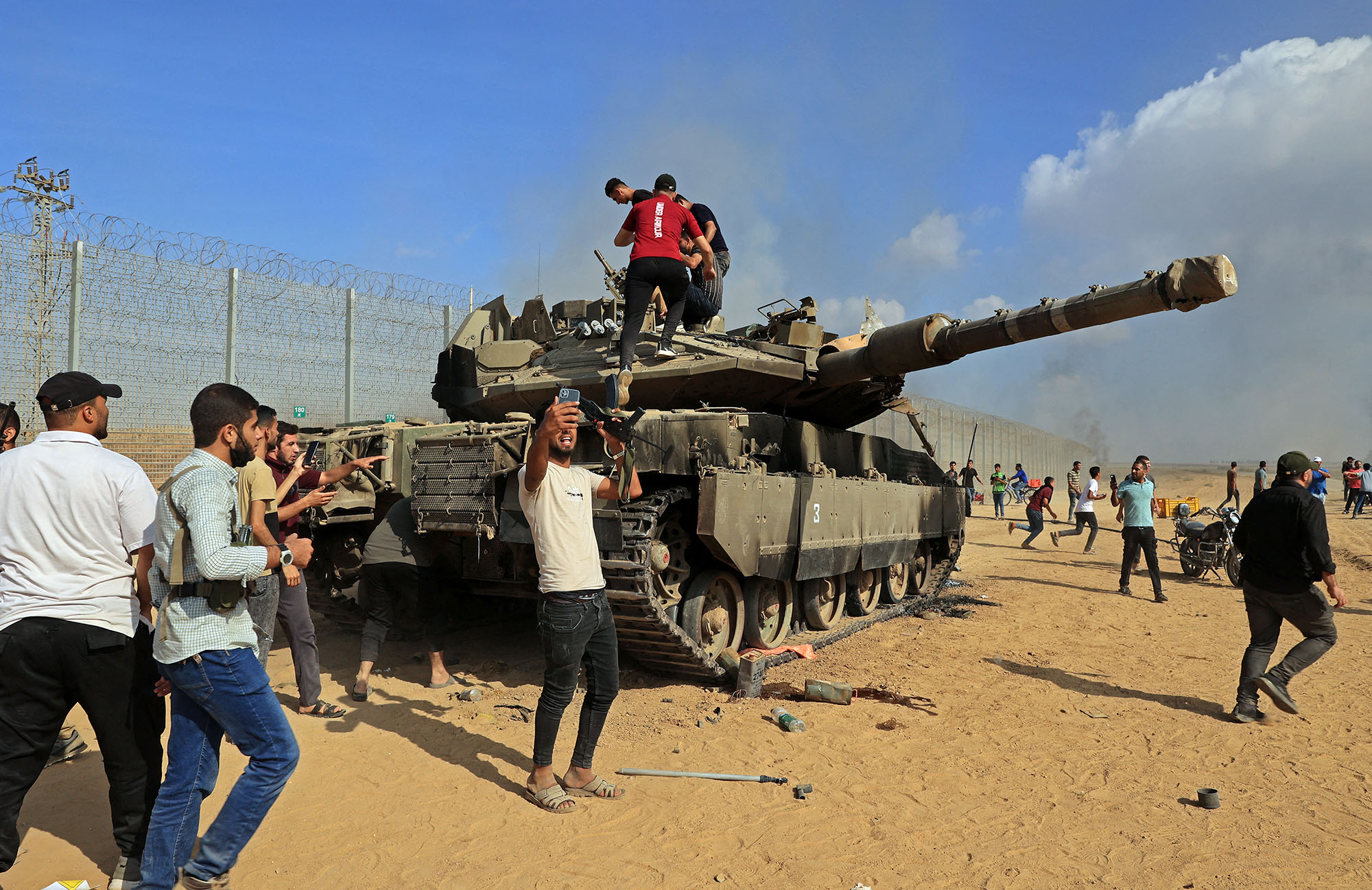Palestinos toman el control de un tanque israelí después de cruzar la valla fronteriza, el sábado, en Khan Yunis, en el sur de la Franja de Gaza.