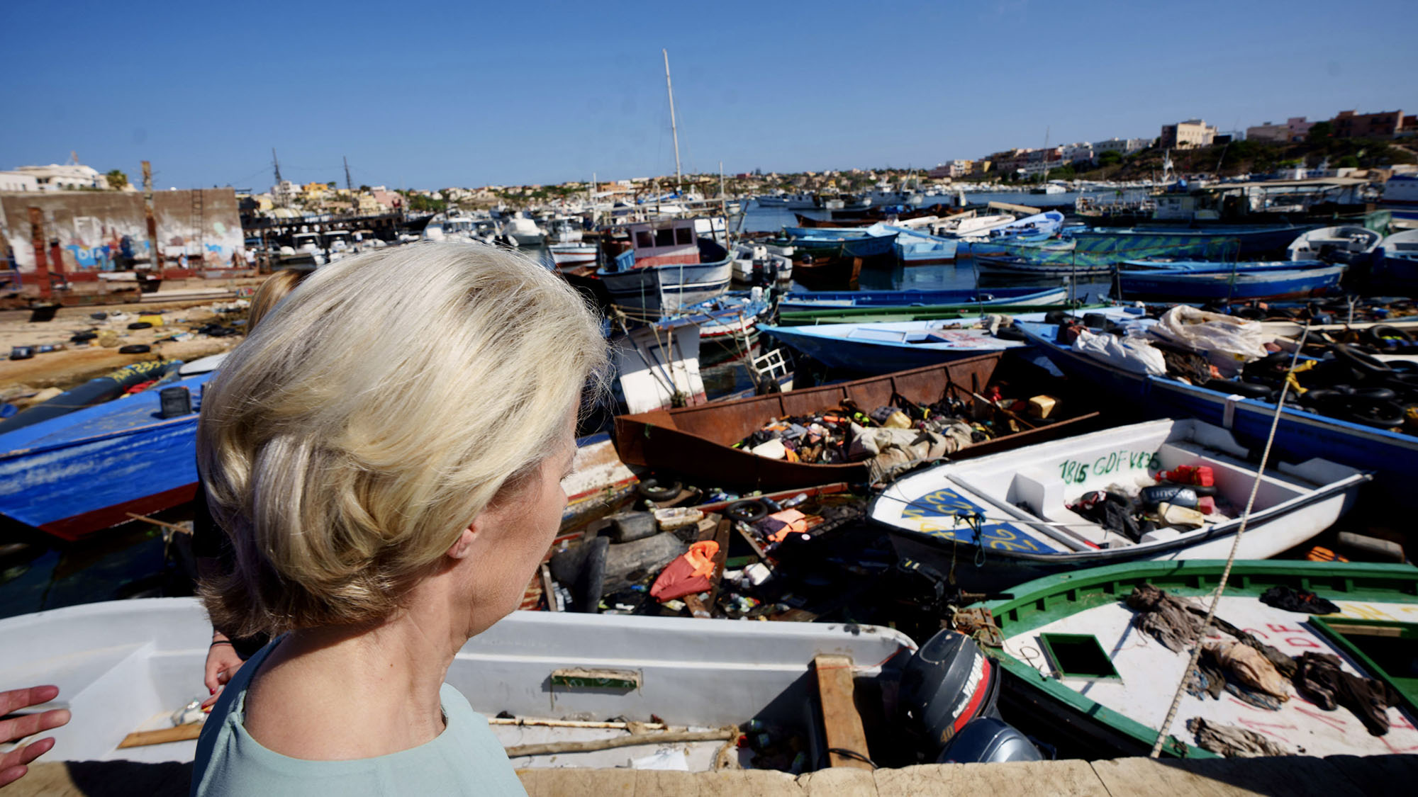 Ursula von der Leyen, presidenta de la Comisión Europea, observa pequeños barcos utilizados por migrantes que han llegado en las últimas semanas a Lampedusa, Italia (17.09.2023).