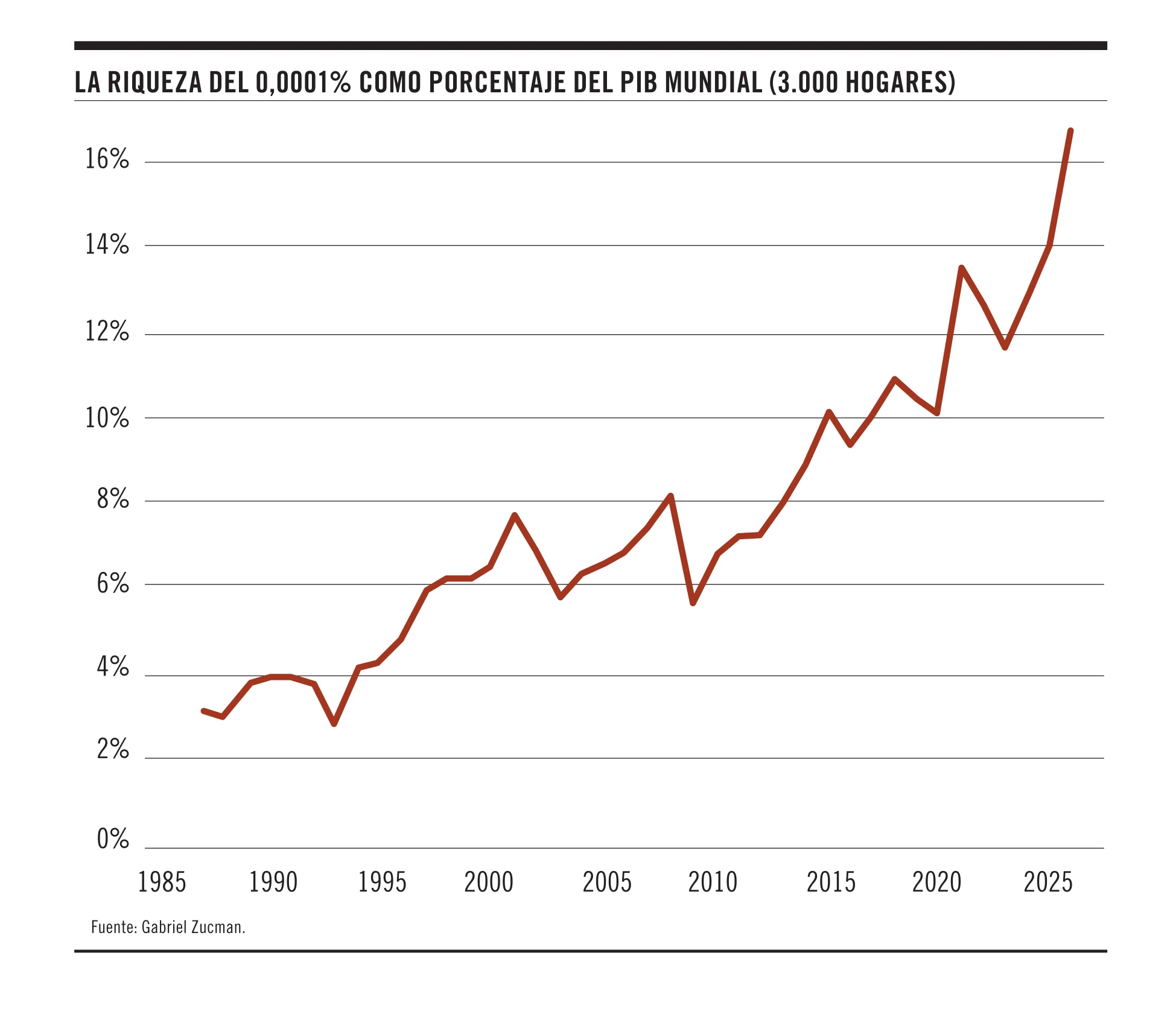 La riqueza del 0,0001% como porcentaje del PIB mundial (3.000 hogares)