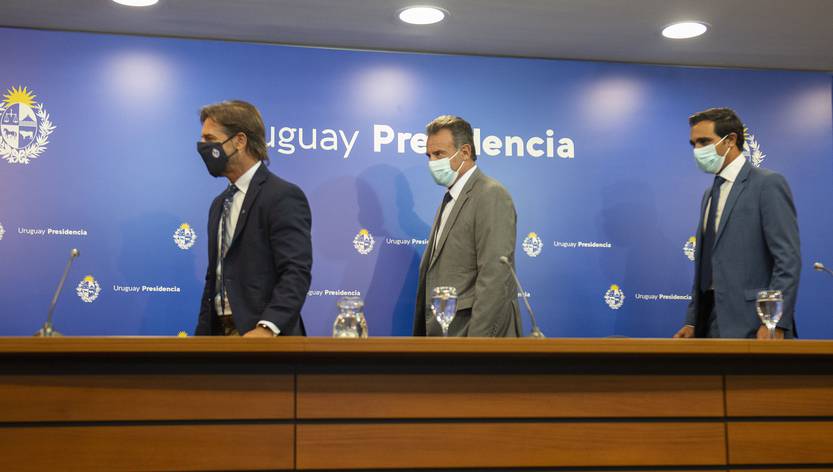 Luis Lacalle Pou, Daniel Salinas y José Luis Satdjian, este lunes, en la Torre Ejecutiva.