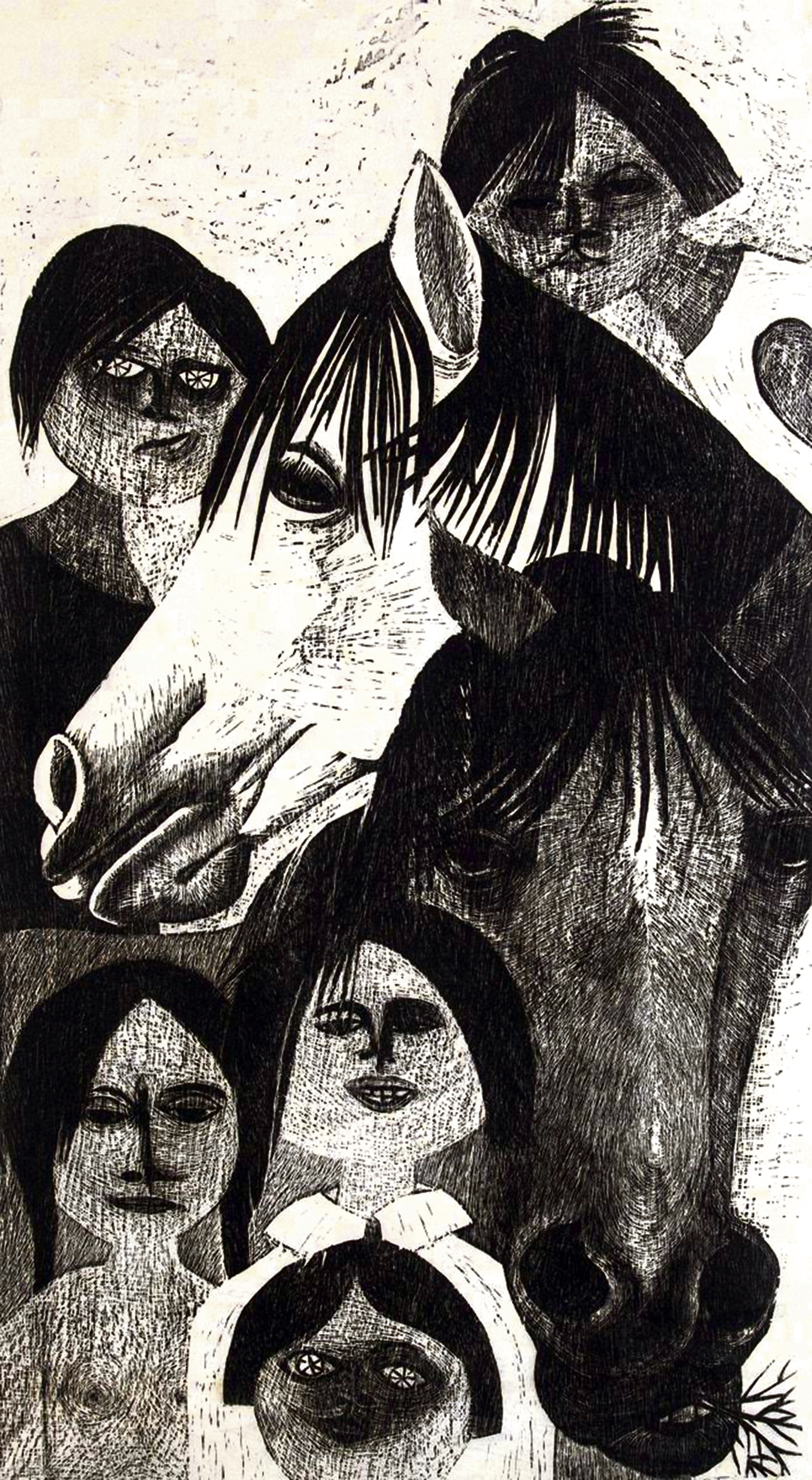 Leonilda González, _Niños y caballos II_, 1966, xilografía sobre papel, 82 x 44,5 cm.