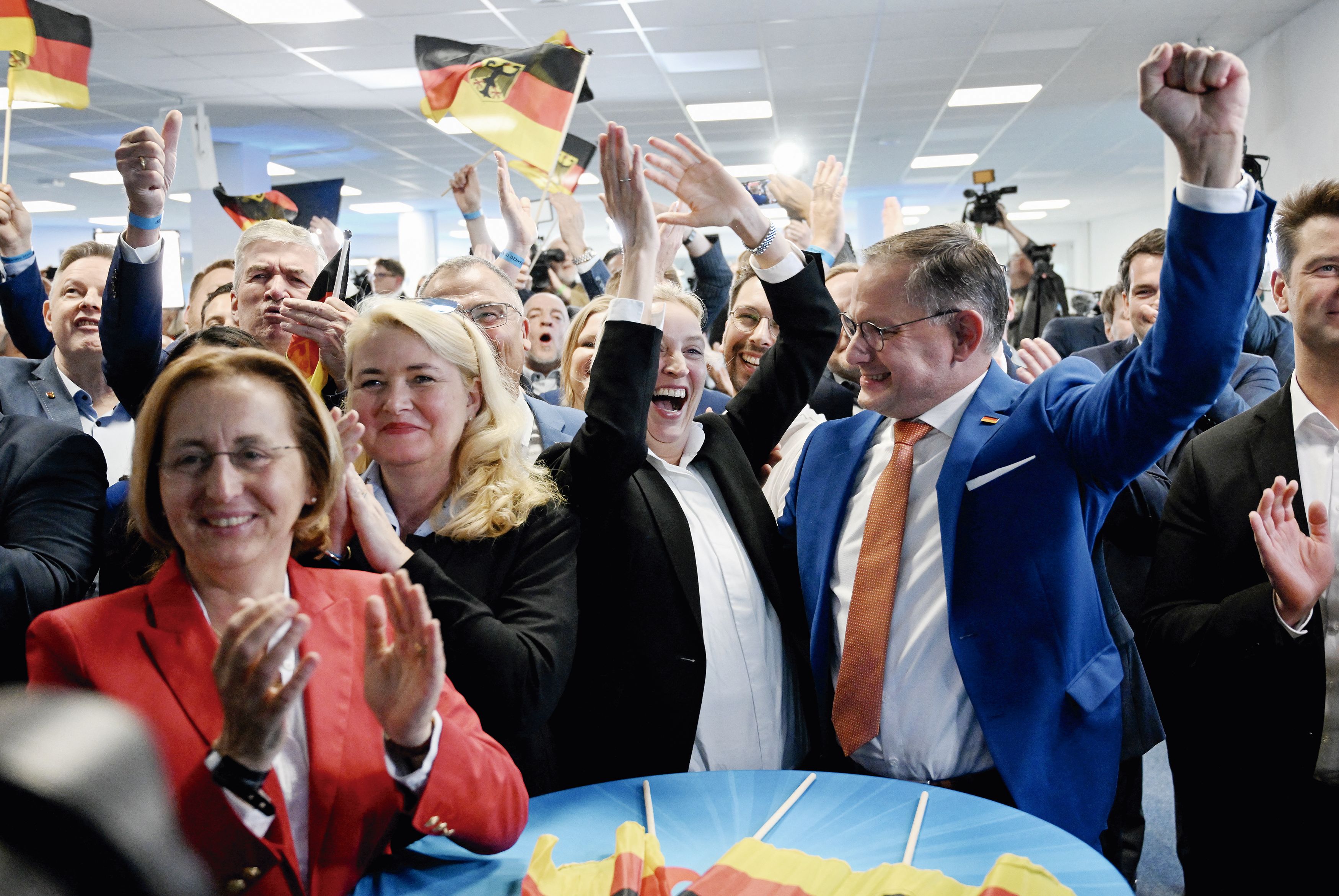 Alice Weidel (centro), Tino Chrupalla y Beatrix von Storch, del partido de extrema derecha Alternativa para Alemania, celebran tras las elecciones al Parlamento Europeo, en Berlín, el 9 de junio de 2024.