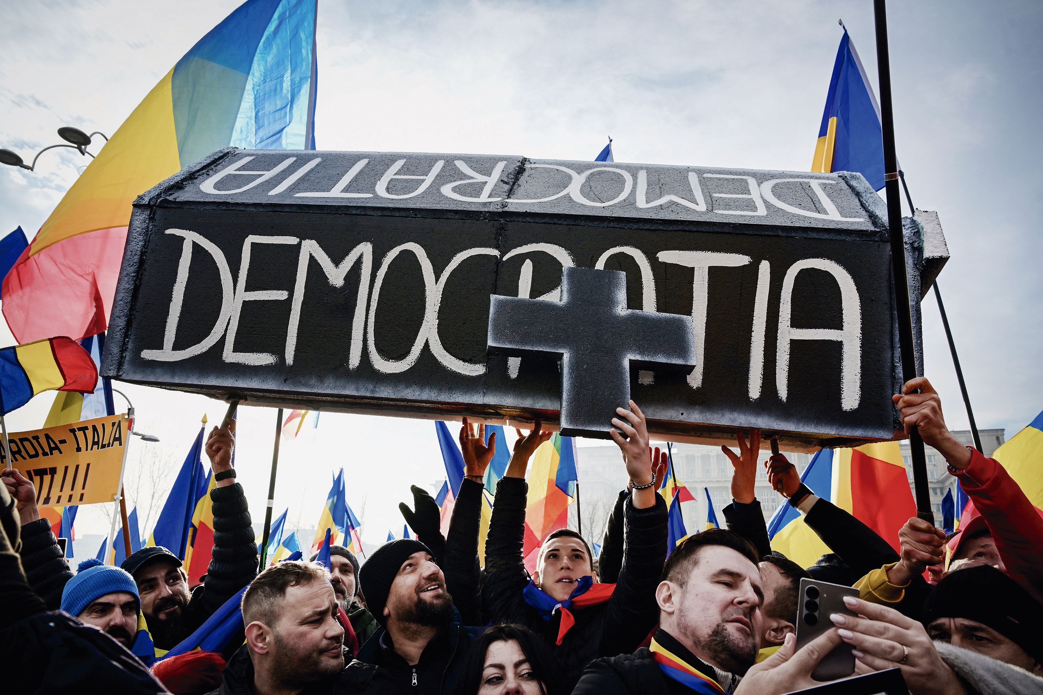 Protesta frente al Tribunal Constitucional contra la anulación de la segunda vuelta de las elecciones presidenciales, el 10 de enero, en Bucarest.
