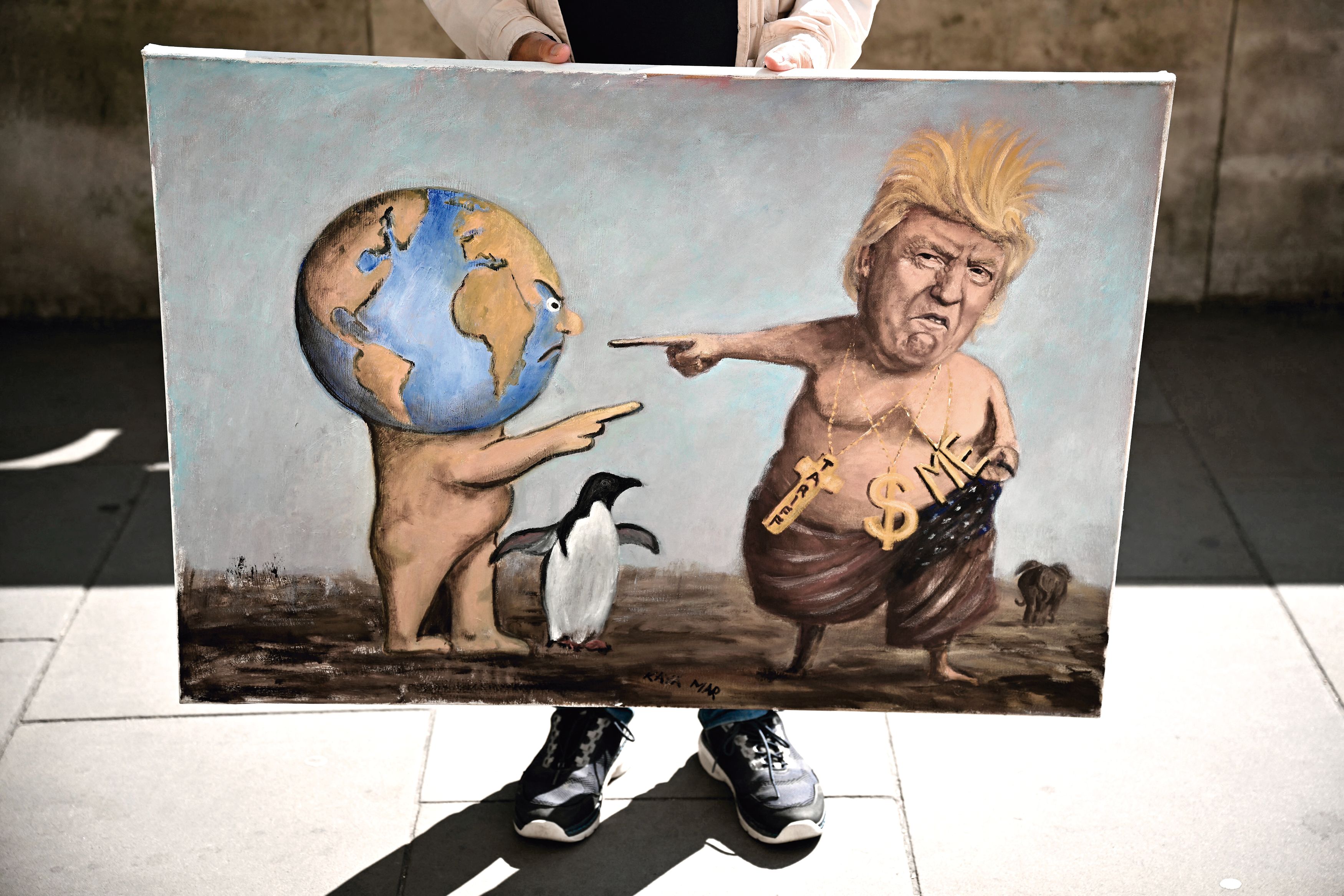 El artista visual Kaya Mar con su pintura afuera de Downing Street, en el centro de Londres, el 30 de abril.