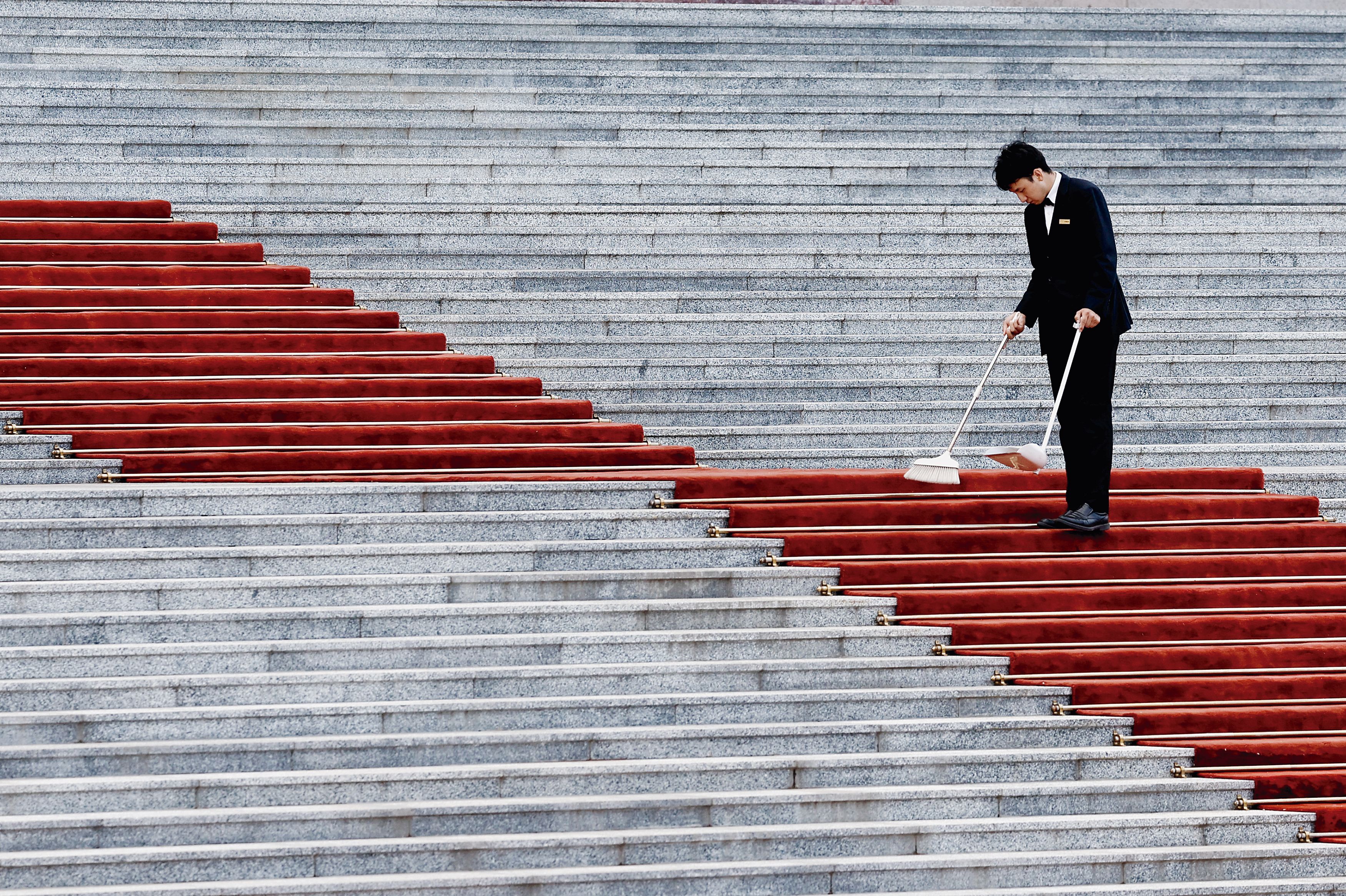 Miembro del personal de protocolo en el Gran Salón del Pueblo, en Pekín, el 31 de mayo de 2024.