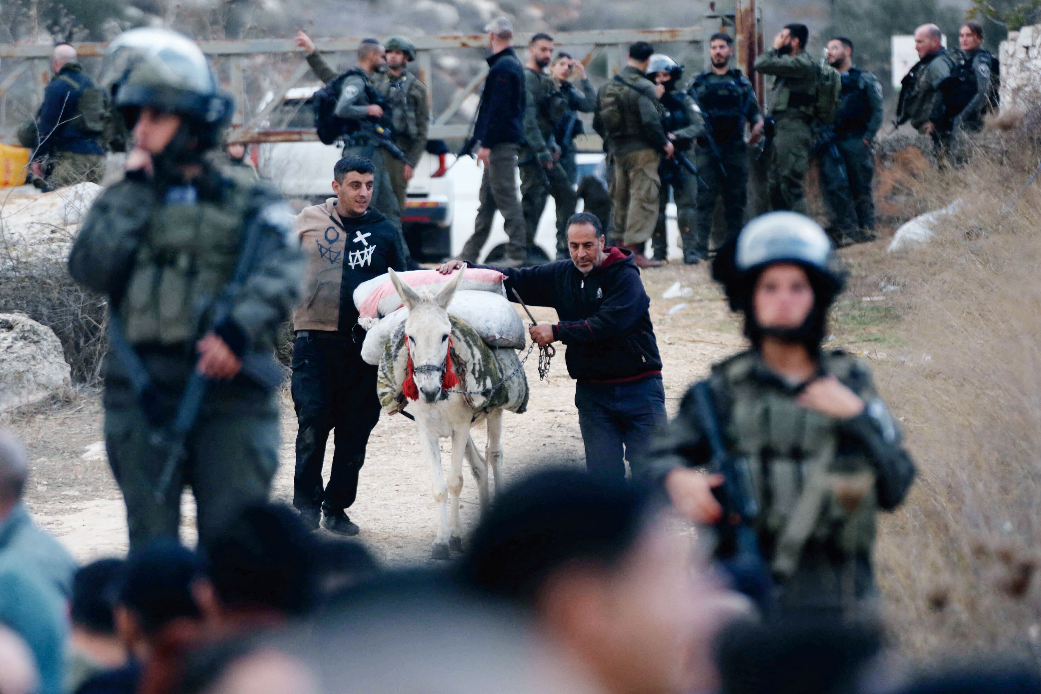 Agricultores palestinos abandonan los olivares tras la intervención de las fuerzas israelíes en la aldea de Salem, al este de Nablus, Cisjordania, el 28 de noviembre de 2024.