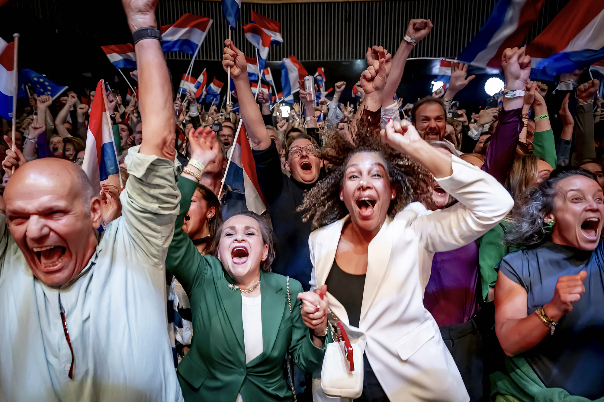 Los miembros del partido Demócratas 66, luego del anuncio de la encuesta a pie de urna, el 29 de octubre, en Leiden.